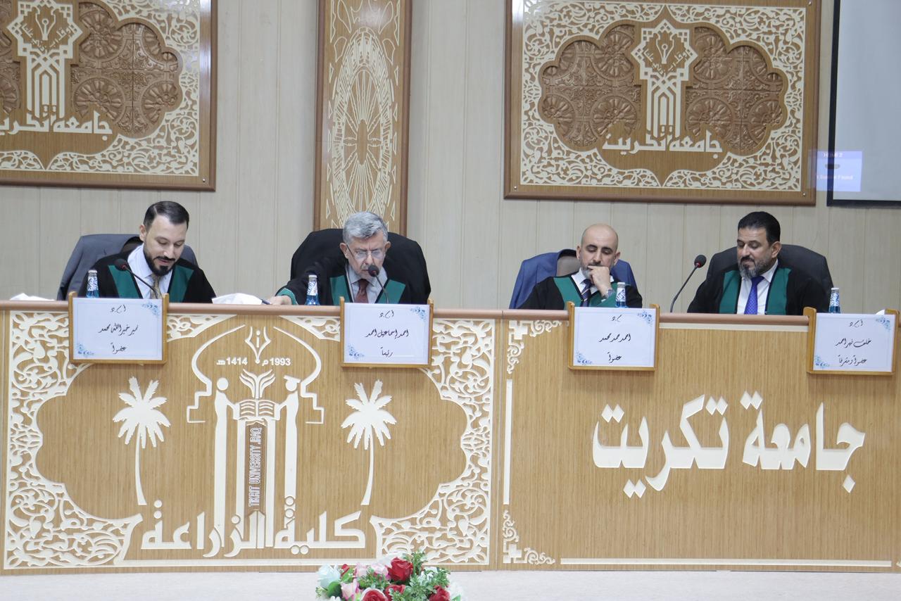 بحضور السيد العميد الاستاذ المساعد الدكتور سامي خضر سعيد.. نوقشت في قسم وقاية النبات بكلية الزراعة - جامعة تكريت رسالة ماجستير للطالبة سارة حسيب عفيتان علي بعنوان (تصنيع مايكروجل الكايتوسان و تدعيمه ببعض المثبطات الحيوية والكيميائية و تقييم كفاءتها في مقاومة مرض تعفن جذور الفلفل)