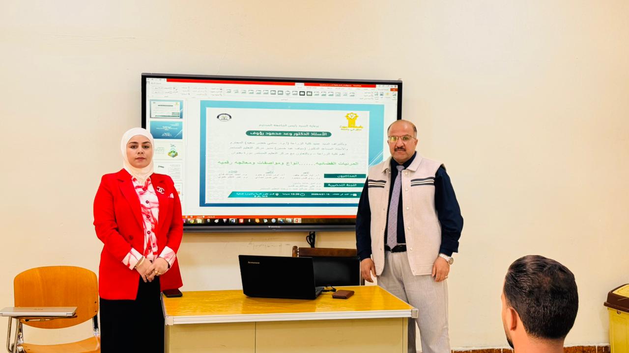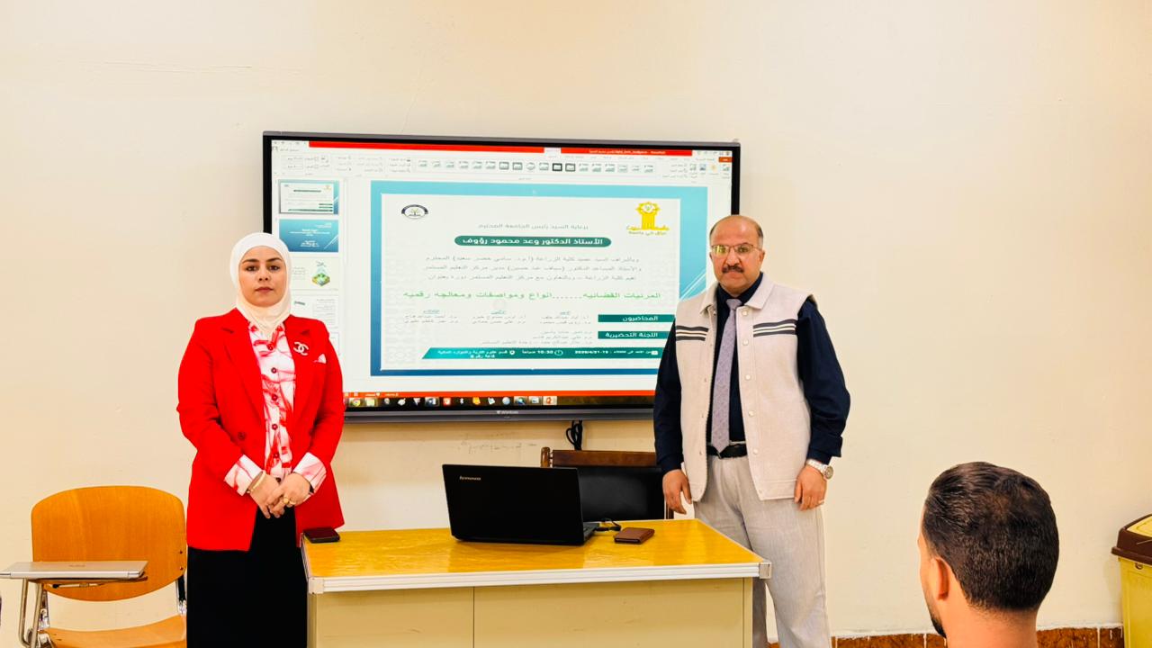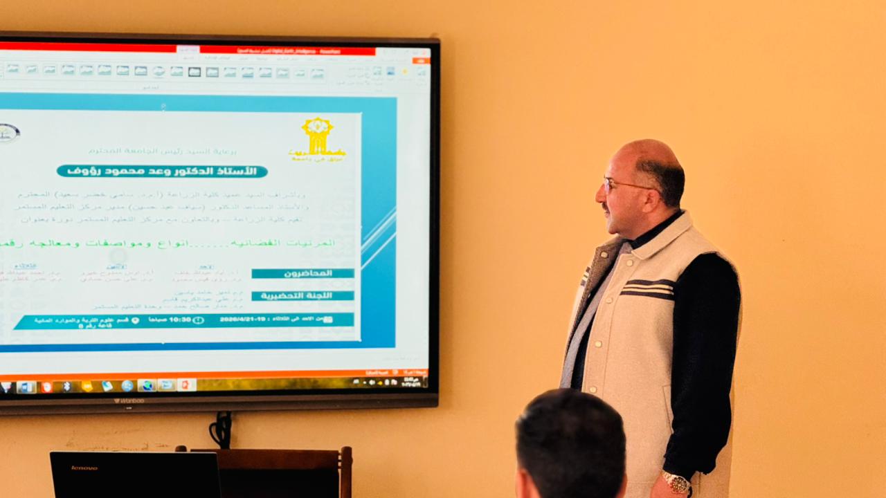 أقامت كلية الزراعة، بالتعاون مع مركز التعليم المستمر، دورة تدريبية علمية بعنوان "المرئيات الفضائية: أنواع ومواصفات ومعالجة رقمية"، وذلك برعاية السيد رئيس الجامعة الأستاذ الدكتور وعد محمود رؤوف، وبإشراف عميد الكلية الأستاذ المساعد الدكتور سامي خضر سعيد، وبمشاركة مدير مركز التعليم المستمر الأستاذ المساعد الدكتور سياف عبد حسين.
