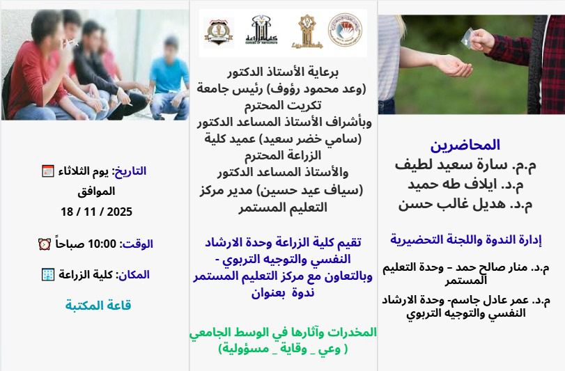 برعاية رئيس جامعة تكريت الأستاذ الدكتور وعد محمود رؤوف، وبإشراف عميد كلية الزراعة الأستاذ المساعد الدكتور سامي خضر سعيد، نظّمت كلية الزراعة ندوة توعوية بعنوان "المخدرات وآثارها في الوسط الجامعي (وعي – وقاية – مسؤولية)"، وذلك بالتعاون مع مركز التعليم المستمر.