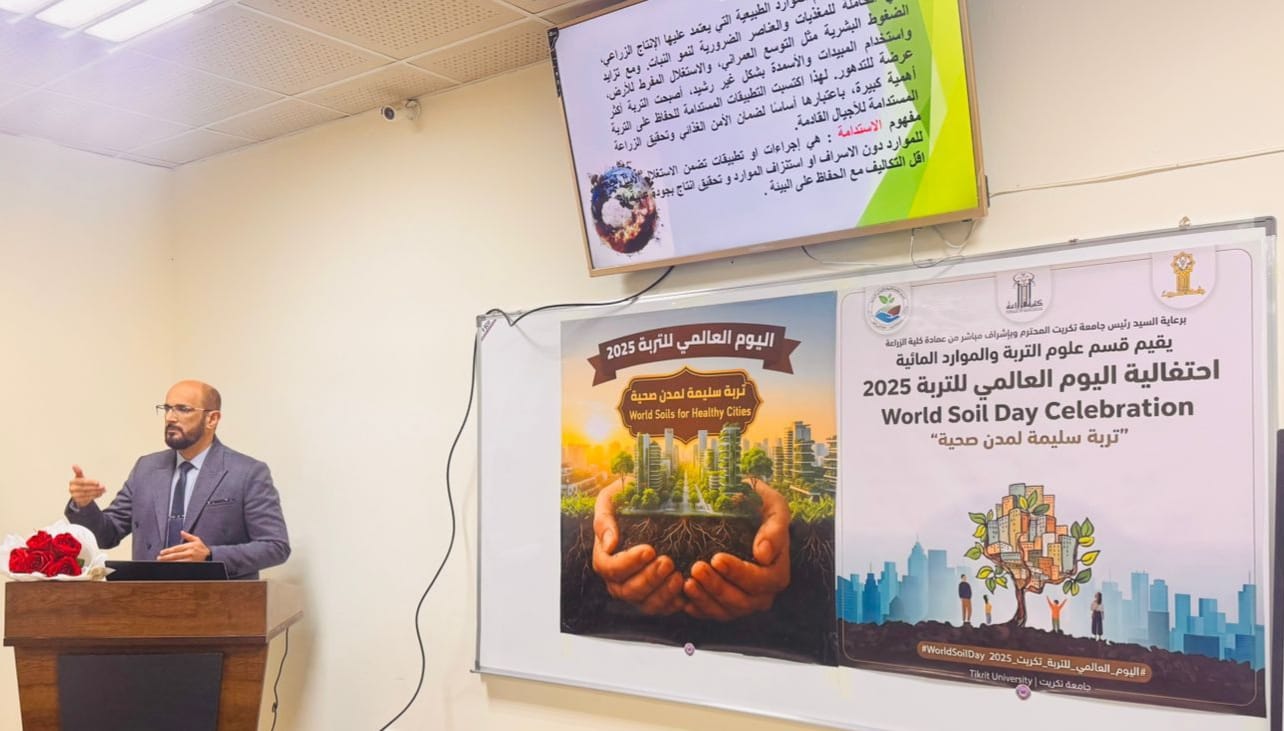 برعاية رئيس جامعة تكريت الأستاذ الدكتور وعد محمود رؤوف، وبإشراف عميد كلية الزراعة الأستاذ المساعد الدكتور سامي خضر سعيد، نظمت كلية الزراعة ندوة علمية موسعة بمناسبة يوم التربة، بالتعاون مع مركز التعليم المستمر، حملت عنوان "التطبيقات المستدامة للحفاظ على التربة".