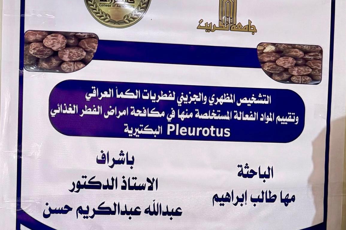 وجاءت هذه الاطروحة بإشراف الأستاذ الدكتور عبدالله عبدالكريم حسن ، تناولت دراسة علمية متقدمة اعتمدت على تقنيات حديثة في التشخيص الجزيئي فضلاً عن تقييم الدور الحيوي للمركبات الفعالة المستخلصة من فطريات الكمأ في الحد من الإصابات البكتيرية التي تصيب الفطر الغذائي .