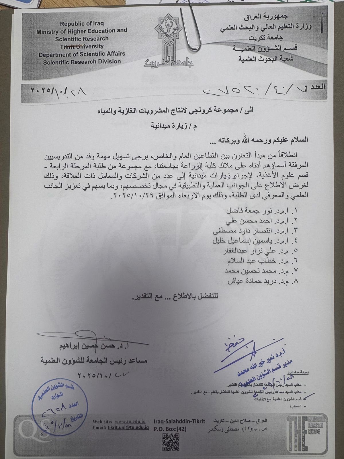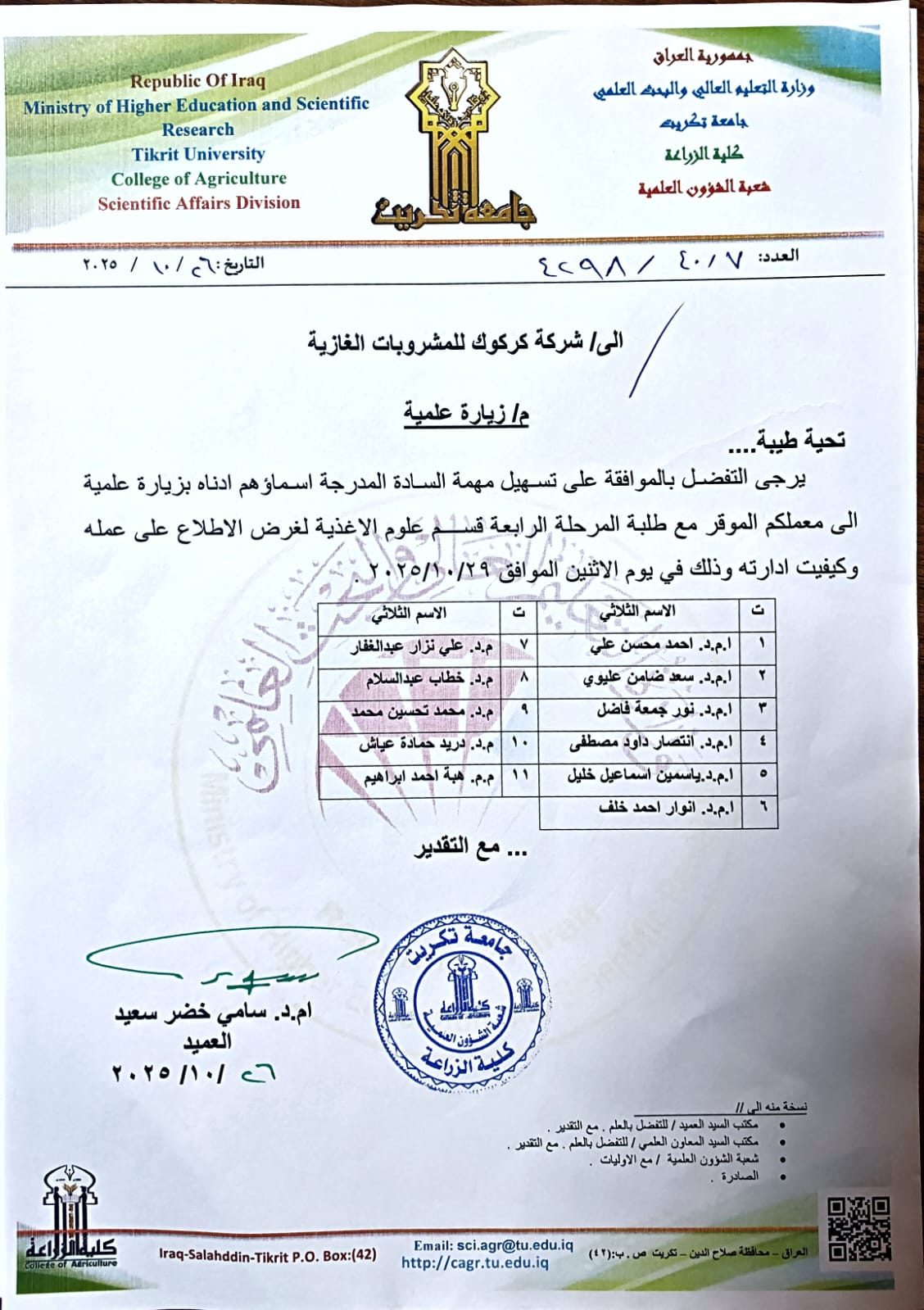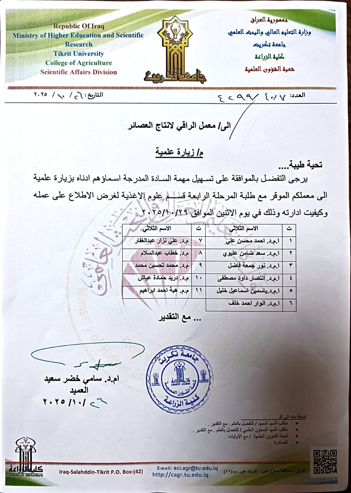 انطلاقًا من حرص كلية الزراعة متمثلة بعميدها الاستاذ المساعد الدكتور سامي خضر سعيد على ربط الجانب النظري بالجانب التطبيقي، وتعزيز المهارات العملية لطلبتها، نظم قسم علوم الأغذية زيارة علمية ميدانية إلى معامل الاغذية في محافظة كركوك وشملت الزيارة معمل الراجي لتصنيع العصائر والمشروبات ومعمل ألبان النبراس ومعمل الممتاز لتصنيع اللحوم ومنتجاتها في محافظة كركوك، وجرت بمشاركة طلبة المرحلة الرابعة وبإشراف نخبة من أساتذة القسم وكادره العلمي المتميز.