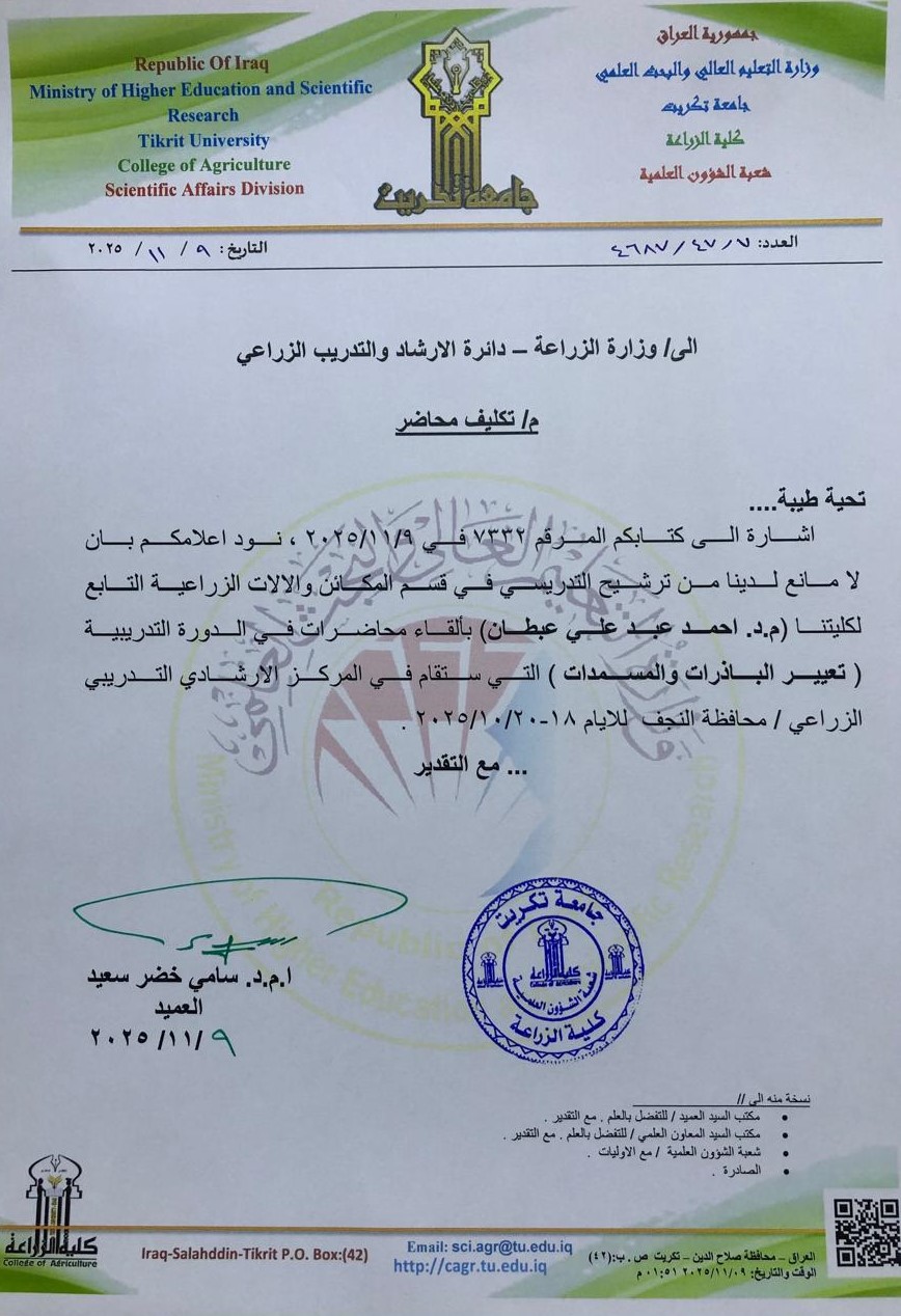 اختتمت دائرة الإرشاد والتدريب الزراعي في وزارة الزراعة أعمال دورتها التدريبية الوظيفية المركزية الموسومة "تعيير الباذرات والمسمدة"، التي نُفّذت على قاعة المركز الإرشادي في محافظة النجف الأشرف للفترة من 2 إلى 4 كانون الأول 2025، وذلك استنادًا إلى توجيهات وزير الزراعة الدكتور عباس جبر العلي المالكي، وبإشراف مباشر من المدير العام للدائرة المهندس منير علي كريدي.