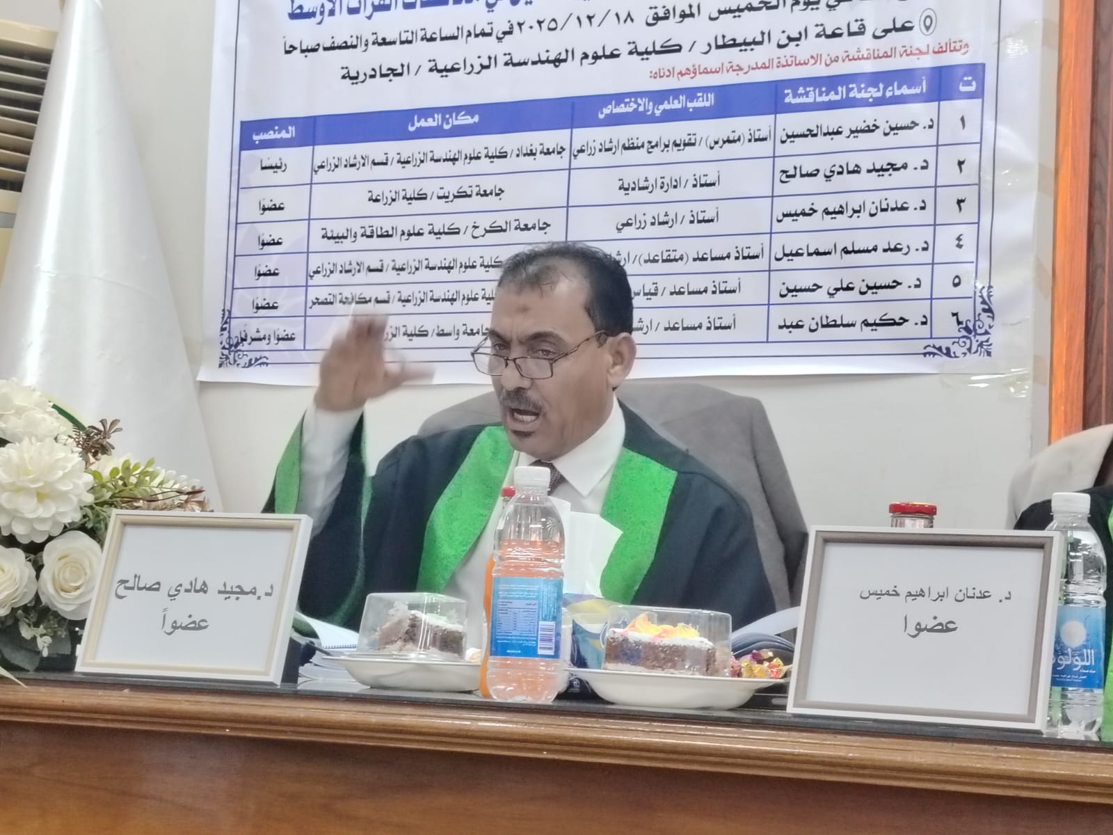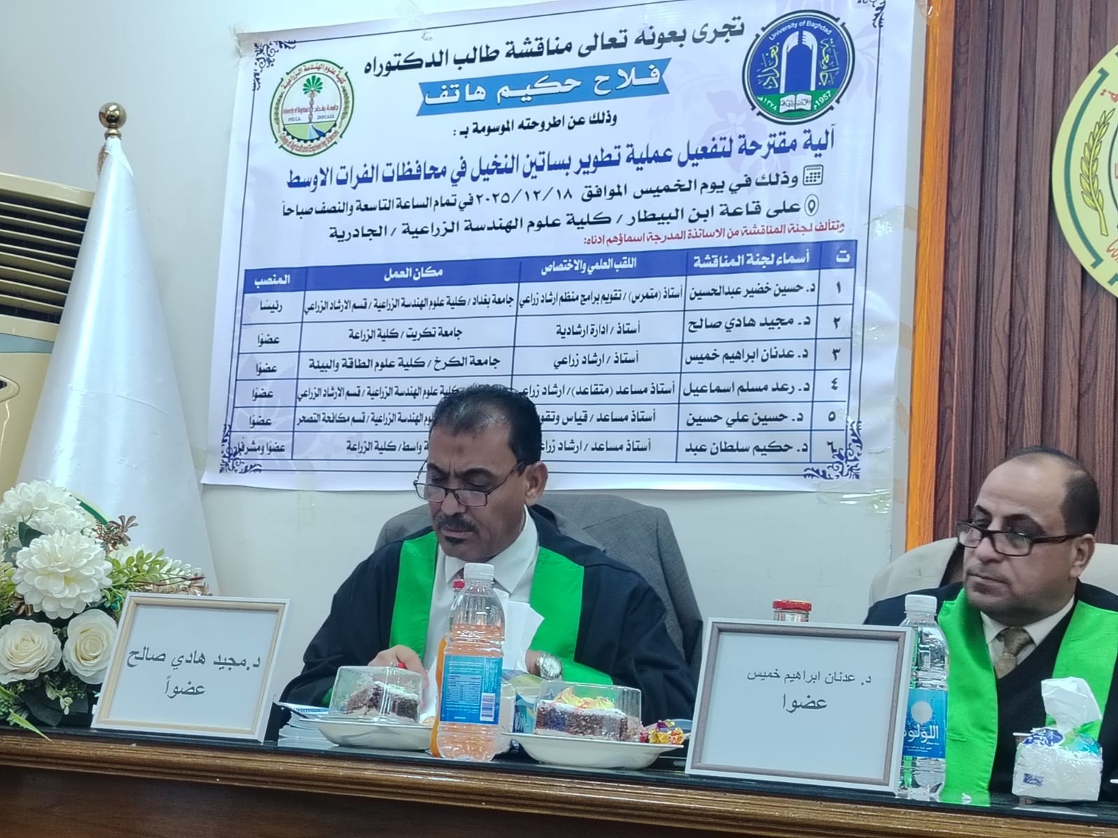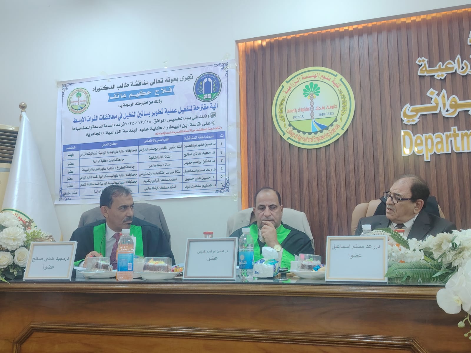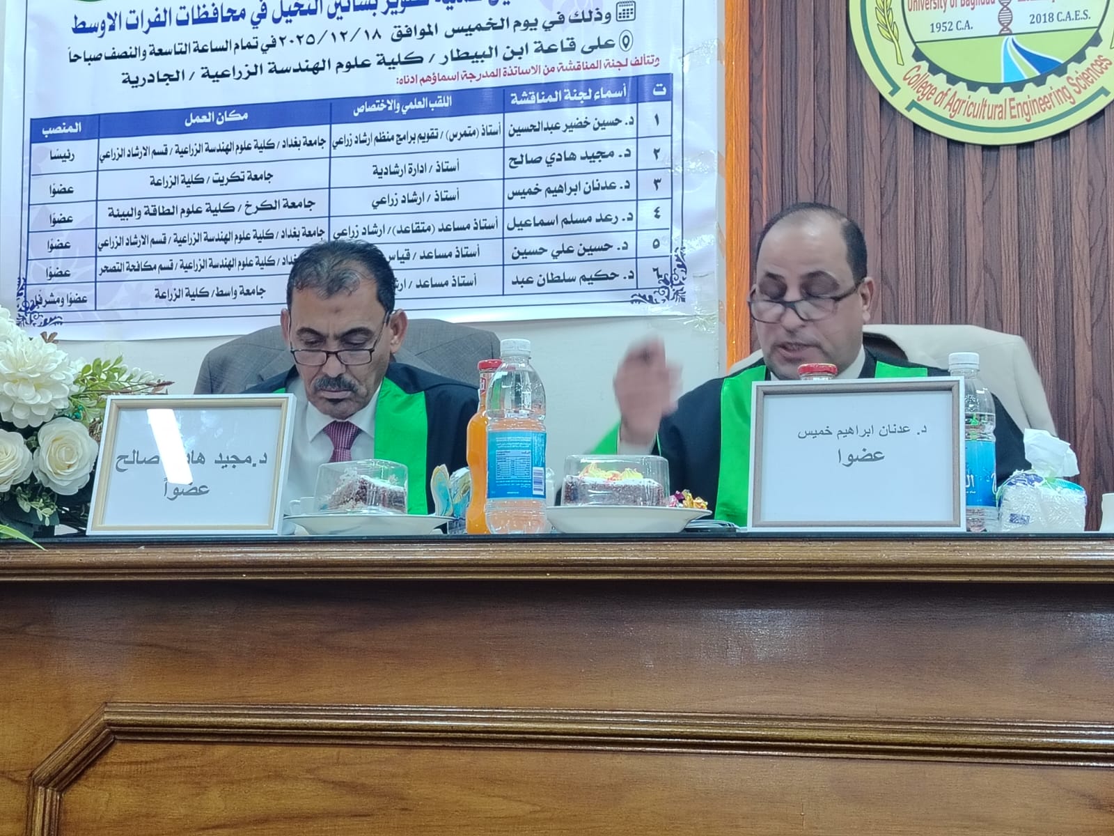 جرت المناقشة يوم الخميس الموافق 4 كانون الأول 2025، الساعة التاسعة والنصف صباحاً، في قاعة ابن سينا بكلية علوم الهندسة الزراعية – جامعة بغداد / الجادرية، وبحضور جمع من الباحثين وطلبة الدراسات العليا.