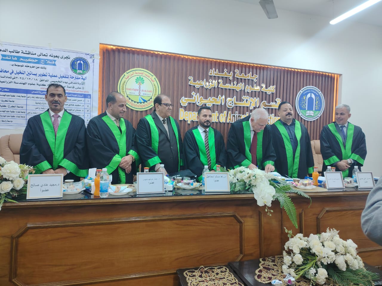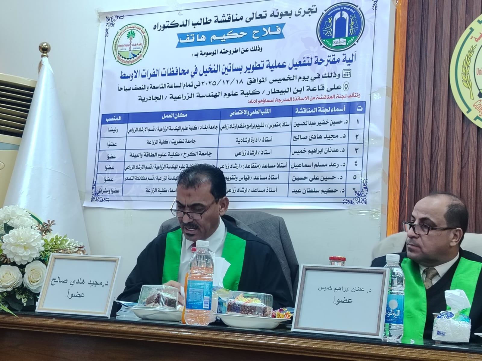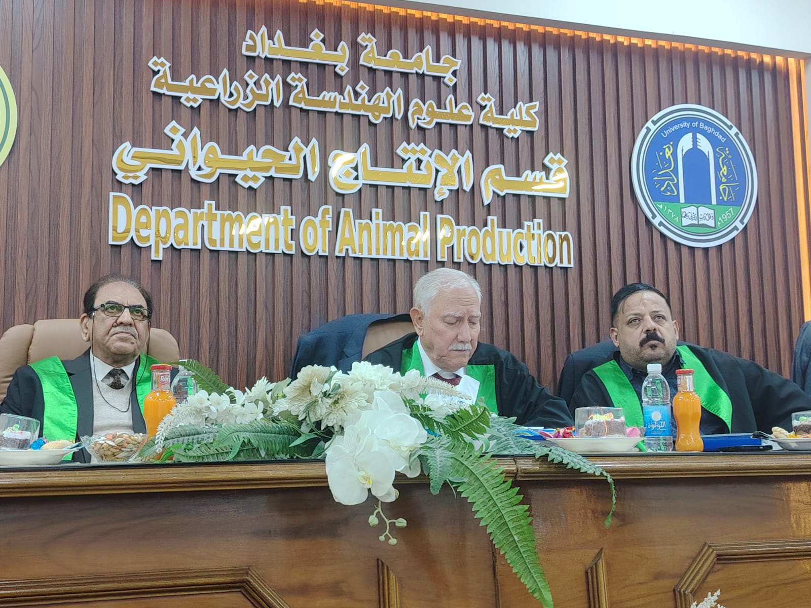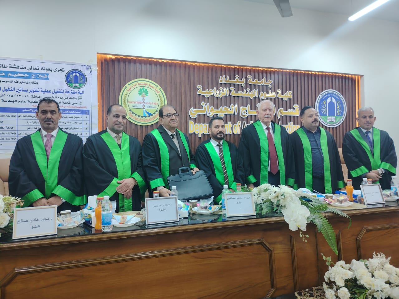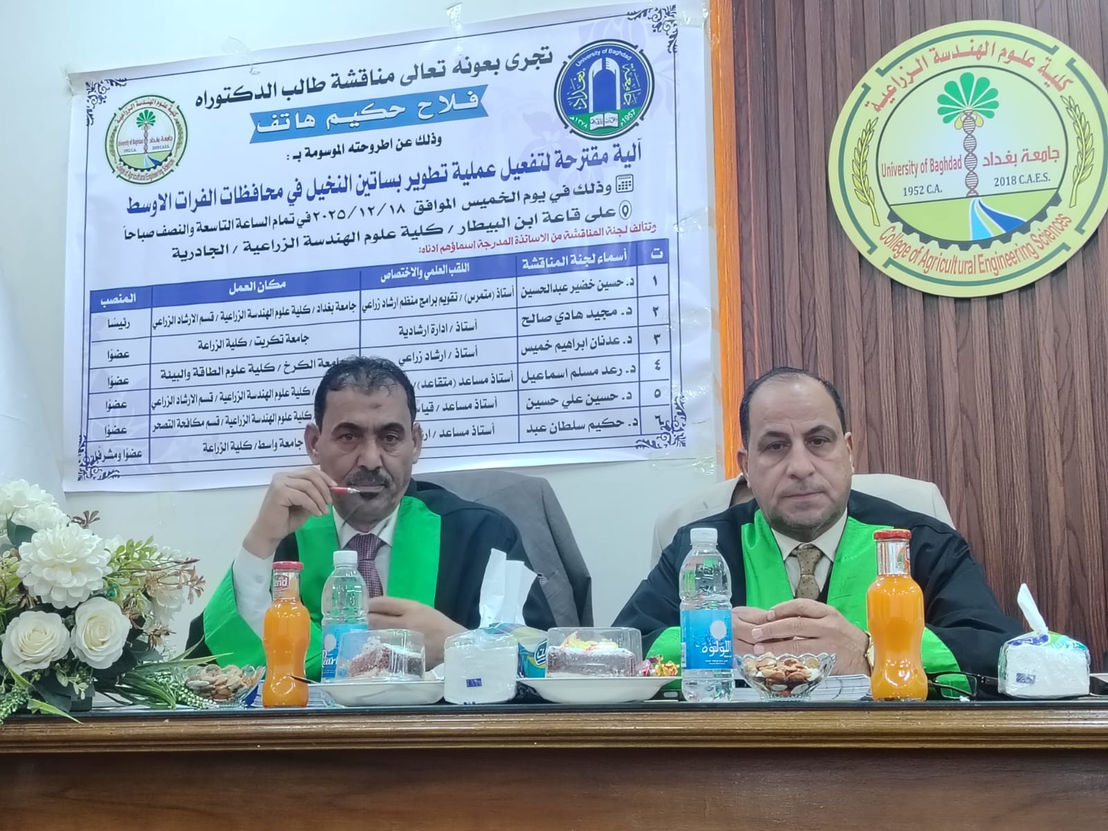 جرت المناقشة يوم الخميس الموافق 4 كانون الأول 2025، الساعة التاسعة والنصف صباحاً، في قاعة ابن سينا بكلية علوم الهندسة الزراعية – جامعة بغداد / الجادرية، وبحضور جمع من الباحثين وطلبة الدراسات العليا.