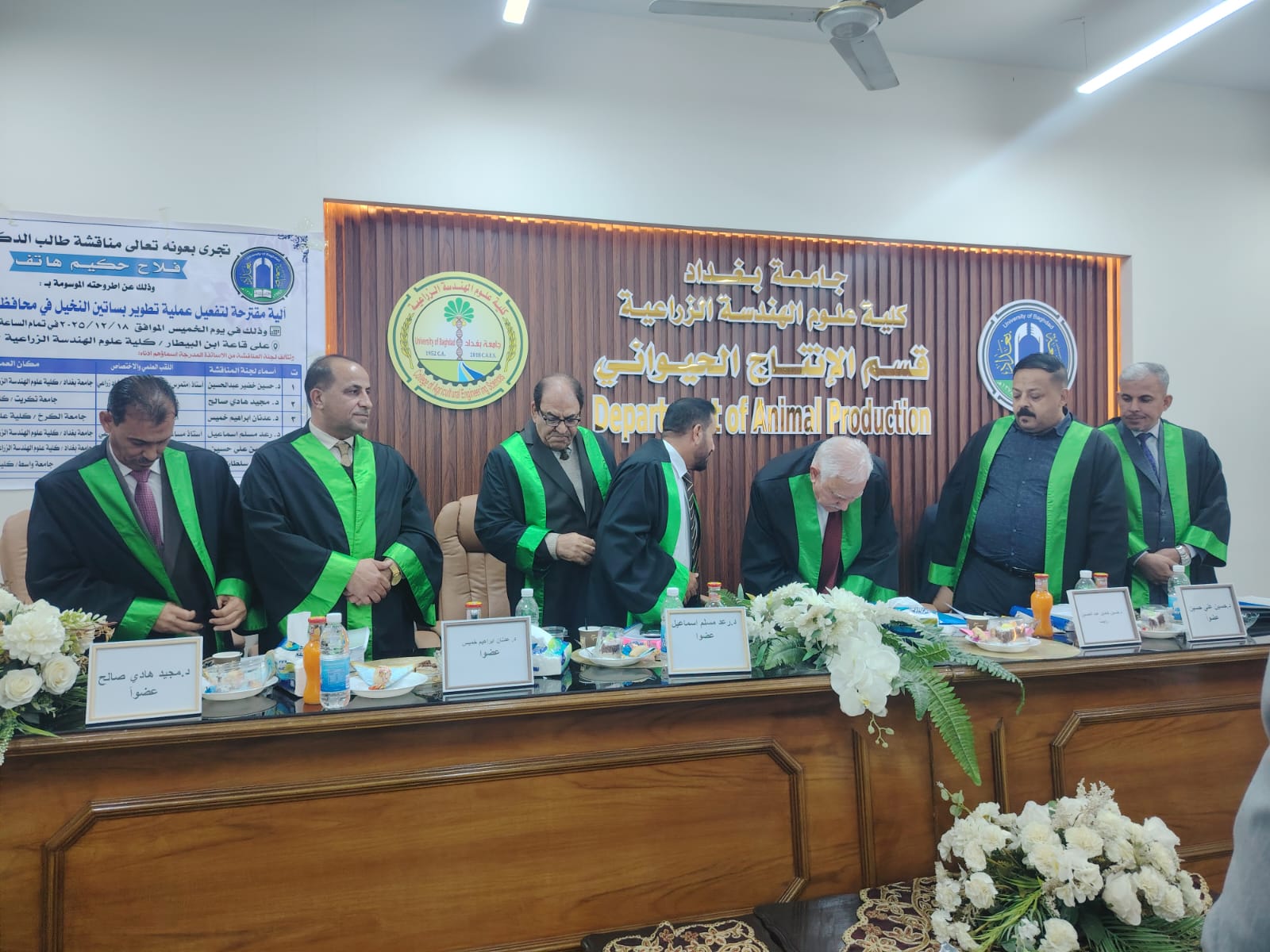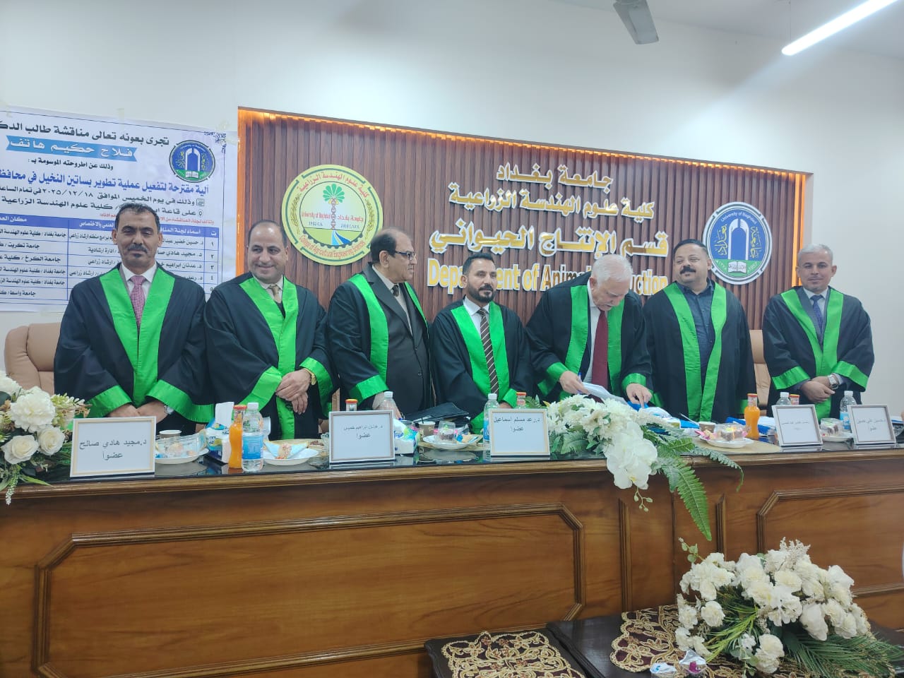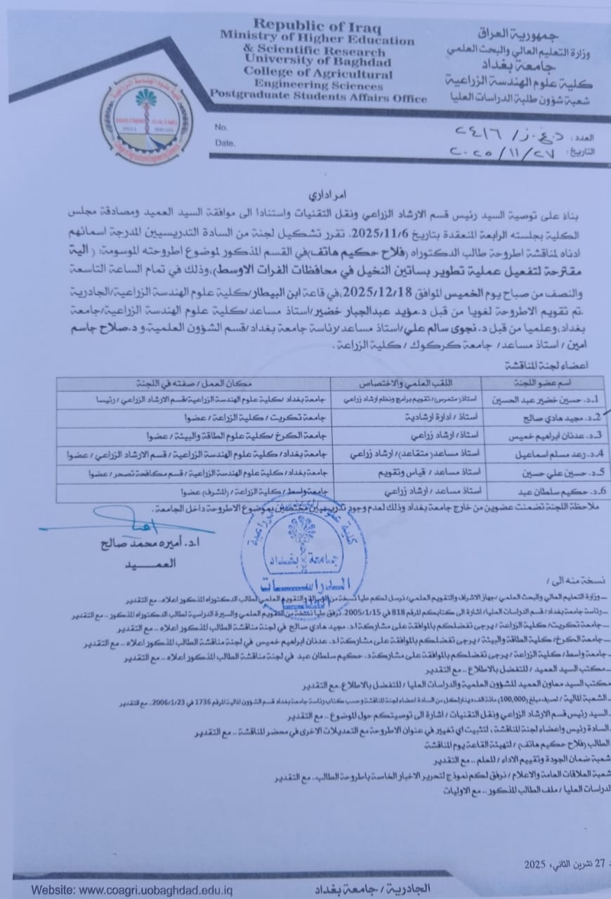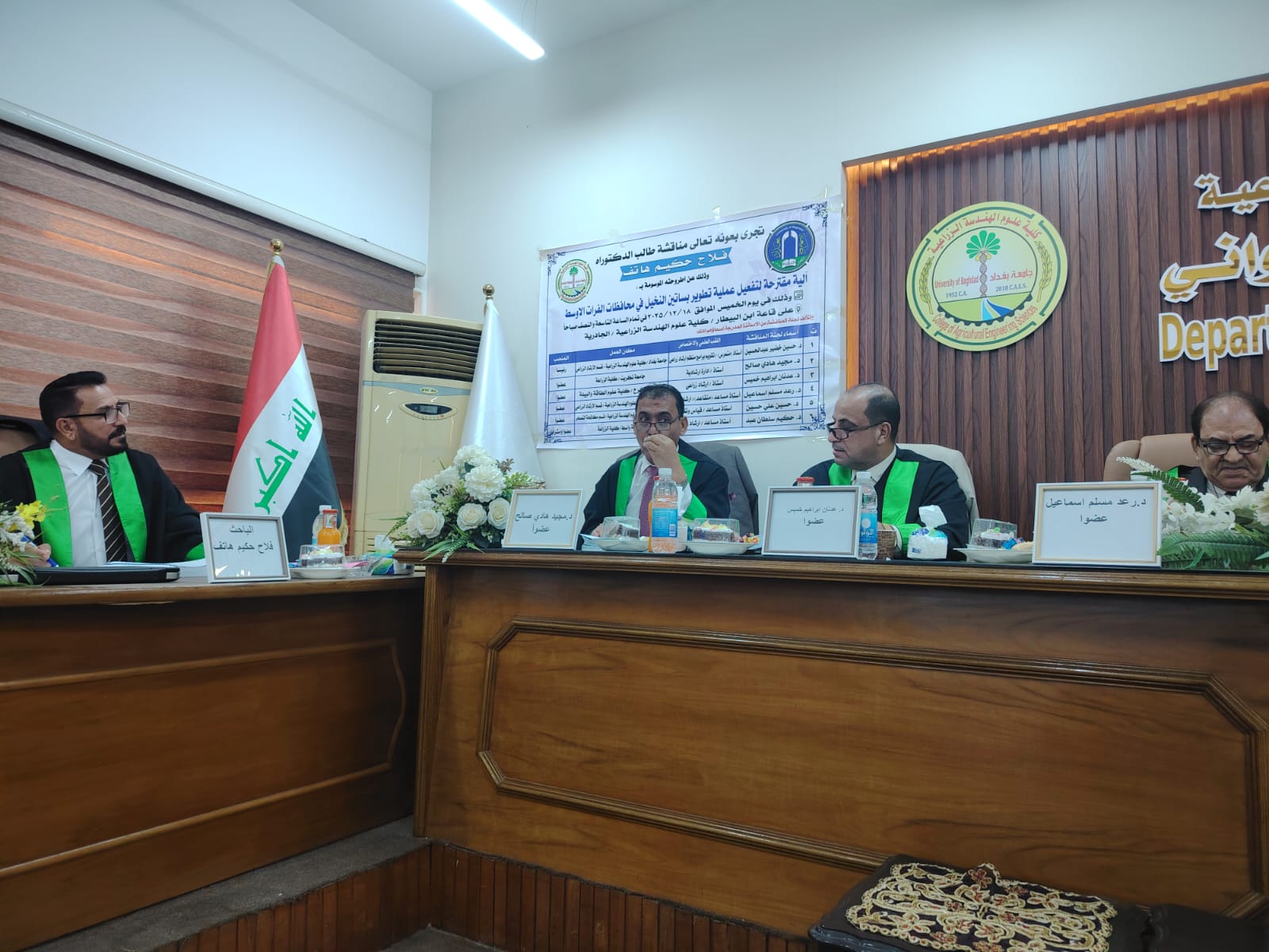 جرت المناقشة يوم الخميس الموافق 4 كانون الأول 2025، الساعة التاسعة والنصف صباحاً، في قاعة ابن سينا بكلية علوم الهندسة الزراعية – جامعة بغداد / الجادرية، وبحضور جمع من الباحثين وطلبة الدراسات العليا.
