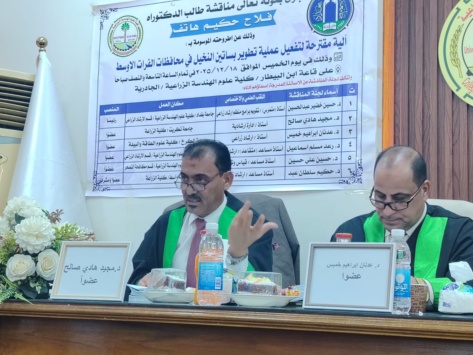 وضمت اللجنة عددًا من الأساتذة المتخصصين في مجالات الإرشاد الزراعي، والإنتاج النباتي، ونقل التقنيات الزراعية من جامعة بغداد والجامعات العراقية الأخرى، إلى جانب إشراف الأستاذ الدكتور جهاد عبد الجبار خضير على الرسالة.