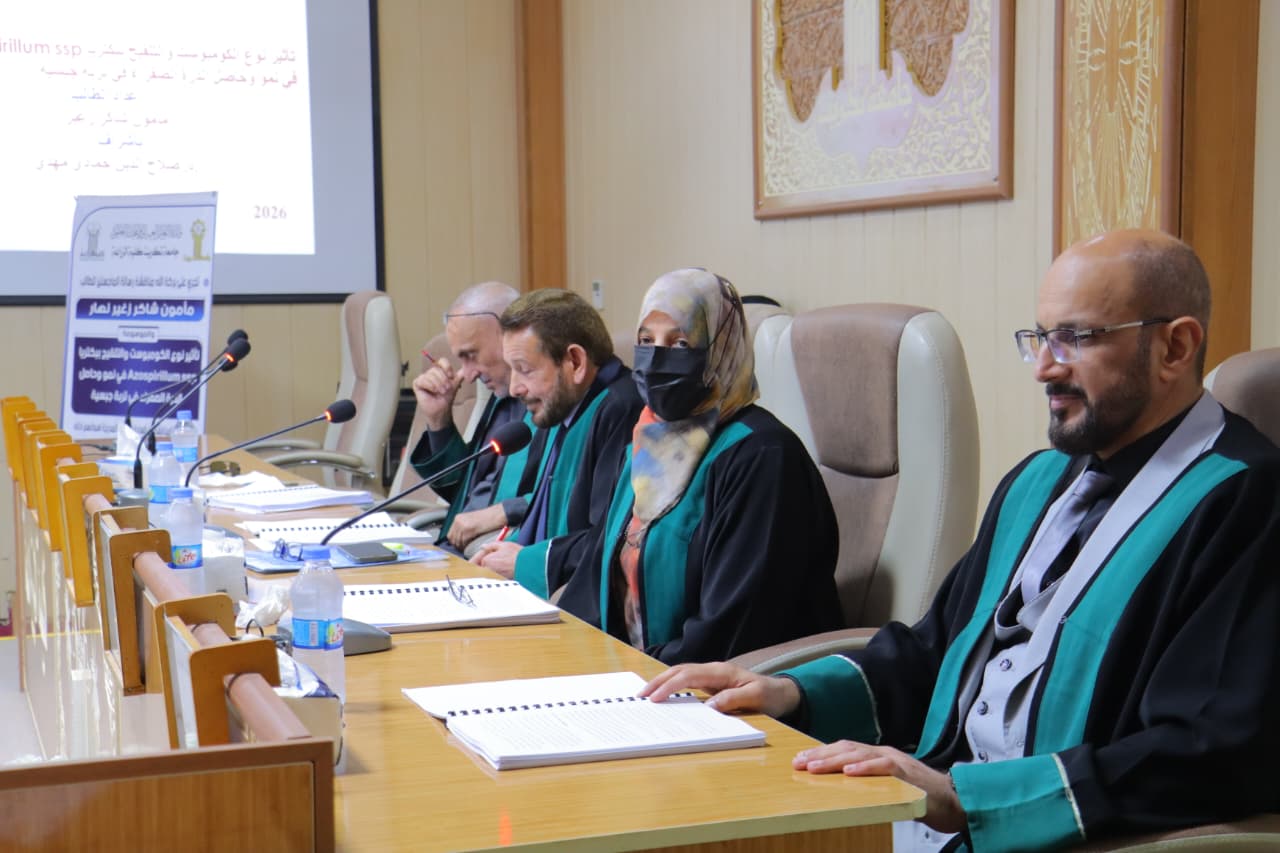وجرت المناقشة بحضور عدد من التدريسيين والباحثين وطلبة الدراسات العليا، في إطار دعم الجامعة للبحث العلمي وتعزيز الدراسات المتخصصة في مجالات الإنتاج النباتي والتقانات الزراعية.