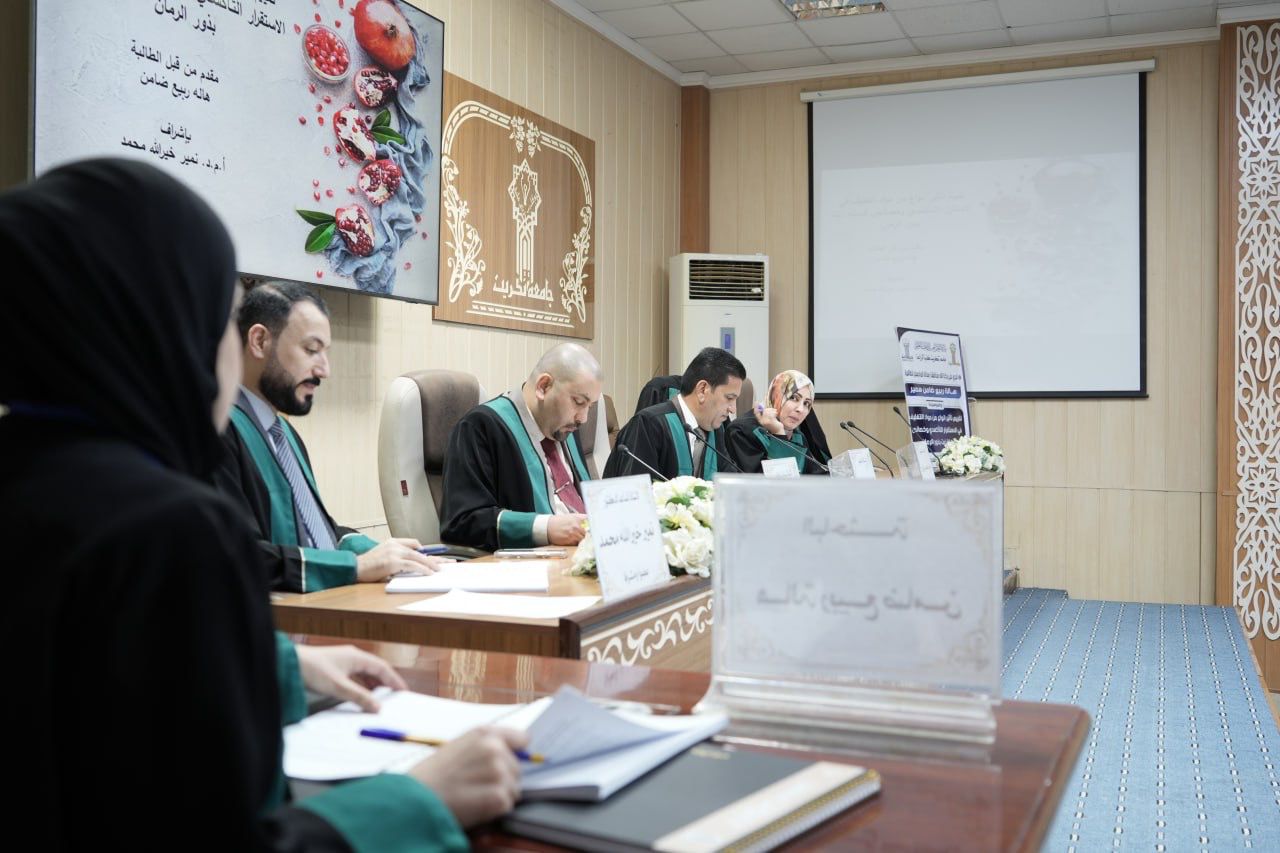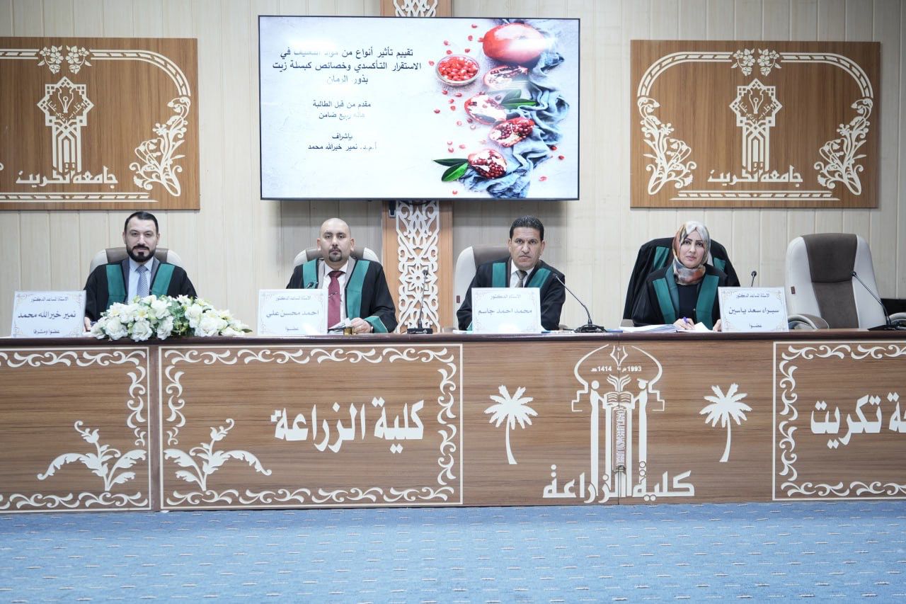 نوقشت في قسم علوم الأغذية بكلية الزراعة في جامعة تكريت رسالة الماجستير الموسومة "تقييم تأثير أنواع من مواد التغليف في الاستقرار التأكسدي وخصائص كبسلة زيت بذور الرمان"، للطالبة هالة ربيع ضامن سمير.